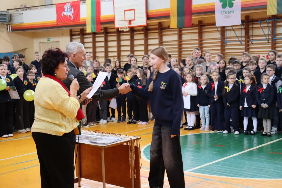 Šventę vainikavo iškilmingas visos gimnazijos bendruomenės susibūrimas sporto salėje. Renginio metu visi kartu sugiedojo Lietuvos himną, pagerbdami valstybės istoriją ir laisvę. Taip pat buvo įteiktos padėkos geriausiai besimokantiems, aktyviausiai mokyklos gyvenime dalyvaujantiems mokiniams, o sporto varžybų nugalėtojai apdovanoti medaliais. Šis Vasario 16-osios minėjimas dar kartą priminė, kad kiekvienas iš mūsų esame savo valstybės dalis, o meilė Tėvynei prasideda nuo pagarbos jos istorijai, tradicijoms ir vieni kitiems. Gimnazijos bendruomenė didžiuojasi galėdama kartu švęsti šią svarbią dieną ir puoselėti pilietines vertybes.